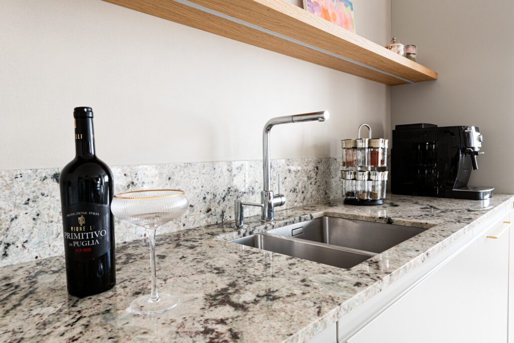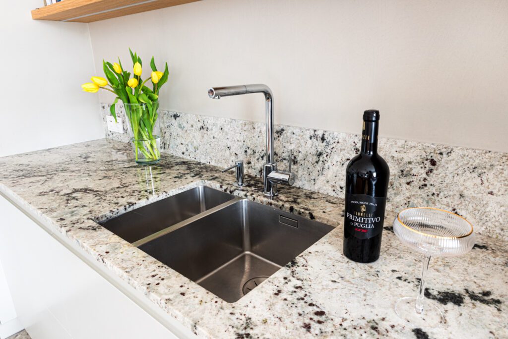 Granit Colonial White to materiał trwały i odporny na uszkodzenia, idealny do codziennego użytkowania. Gładka, polerowana powierzchnia łatwo się czyści, a naturalny wzór kamienia nadaje kuchni indywidualny i ponadczasowy charakter.