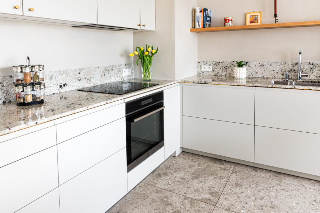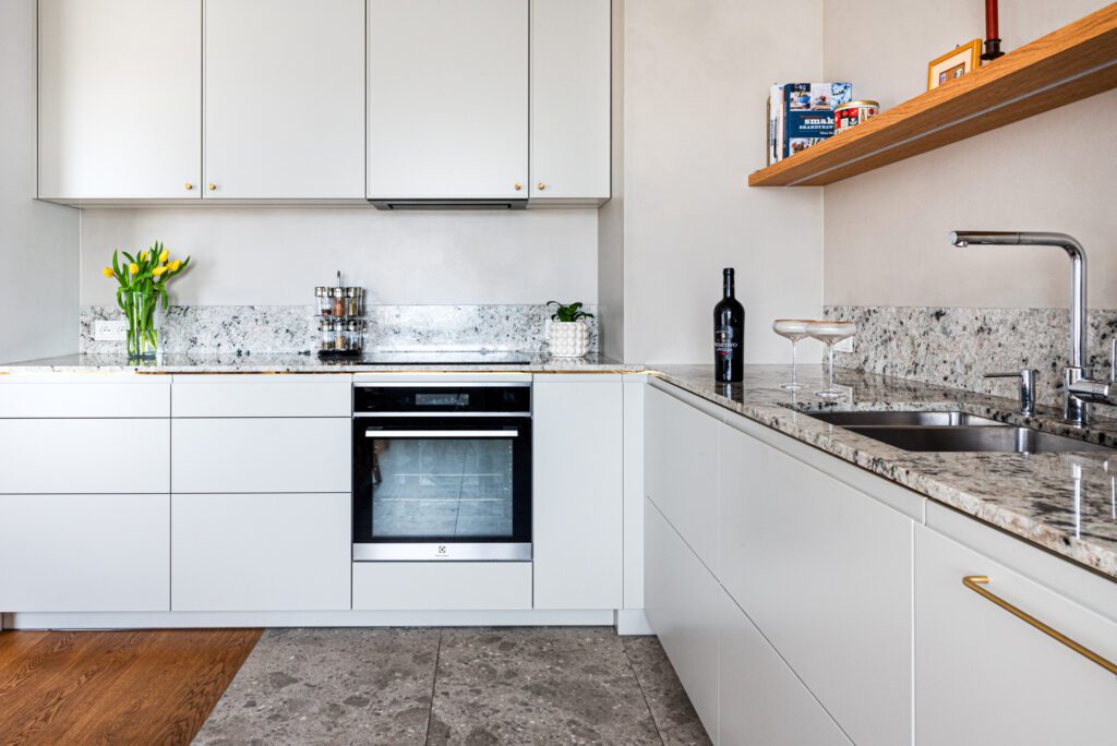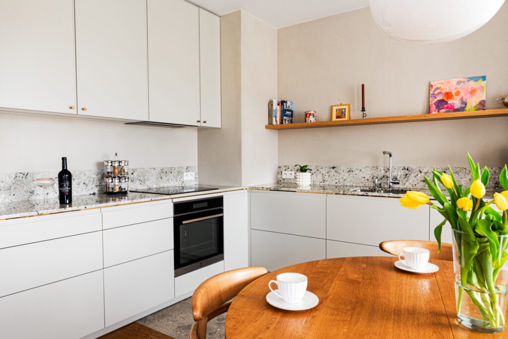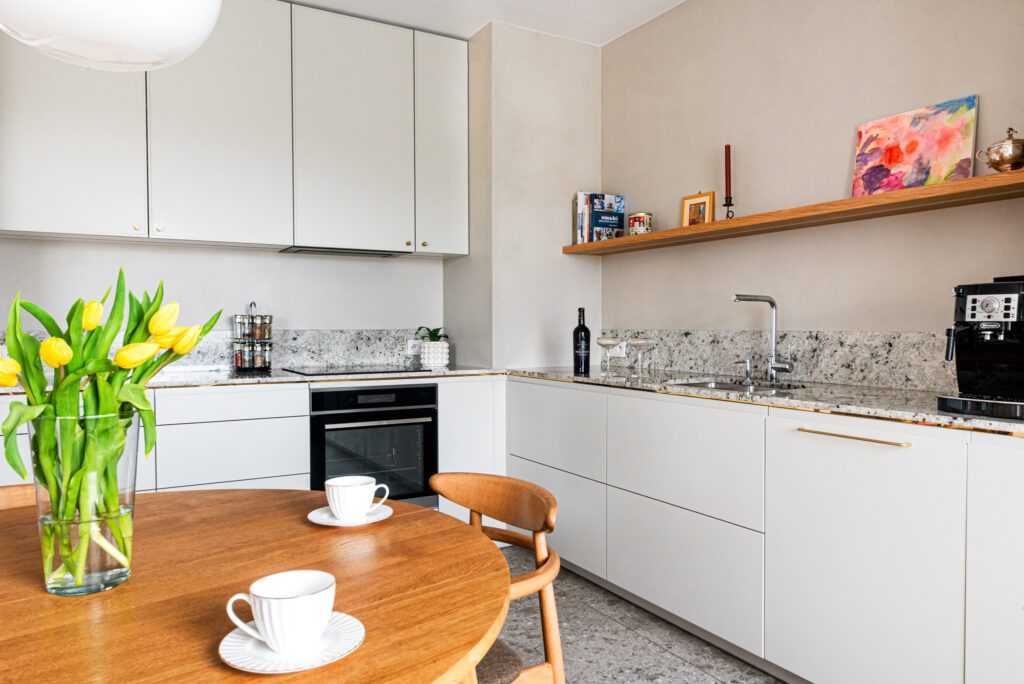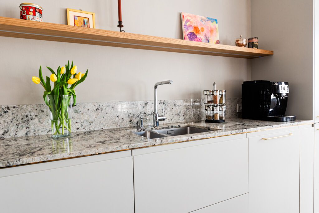 Nowoczesna i funkcjonalna kuchnia z blatem wykonanym z naturalnego granitu Colonial White. Jasna kolorystyka kamienia z delikatnymi szaro-fioletowymi akcentami świetnie współgra z białymi frontami mebli i drewnianymi detalami, tworząc eleganczne i przytulne wnętrze.
