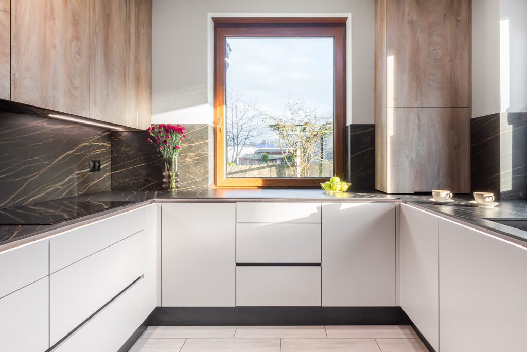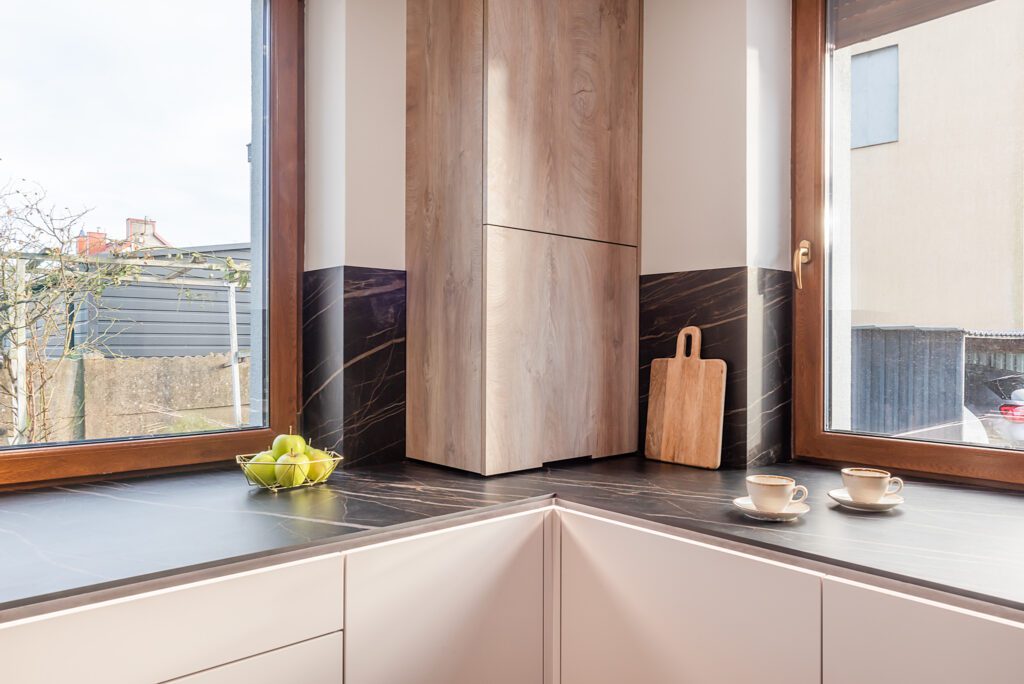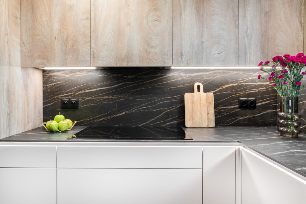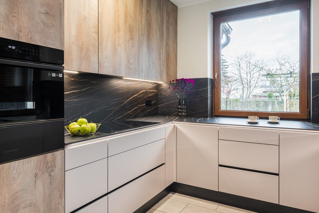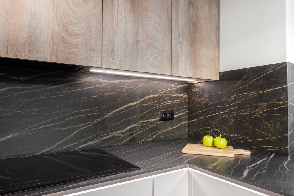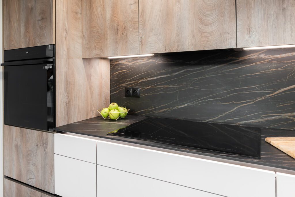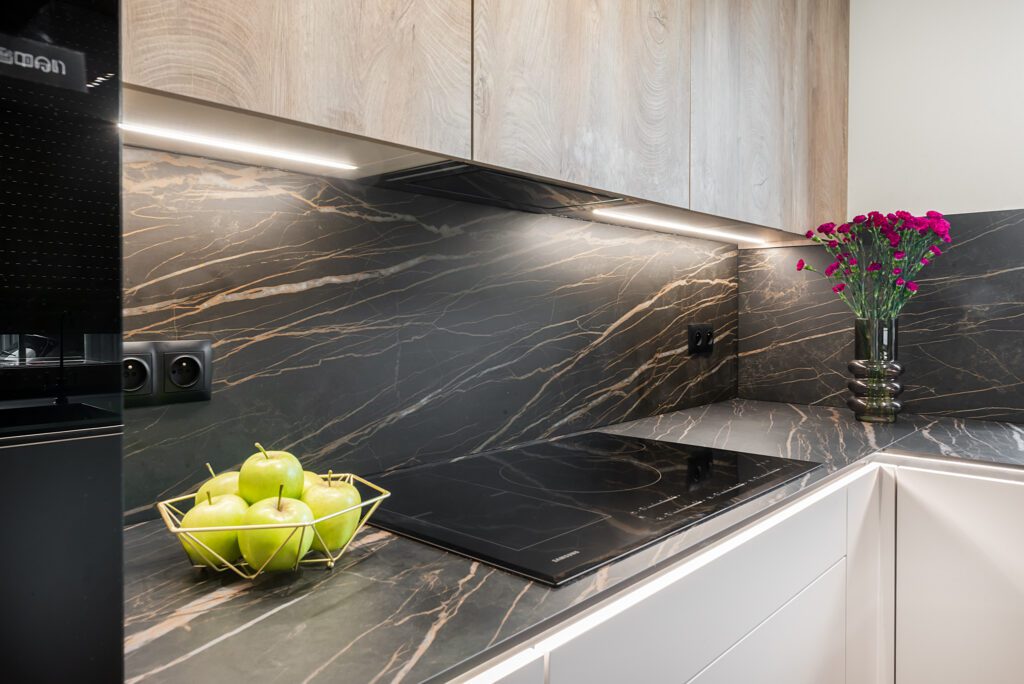 Wyjątkowa realizacja kuchni z wykorzystaniem eleganckiego spieku kwarcowego Laminam Naturali Noir Desire. Ciemna, grafitowa powierzchnia z efektownym, złoto-miedzianym użyleniem tworzy odważny i nowoczesny charakter wnętrza, idealnie komponując się z naturalnym drewnem i minimalistycznymi białymi frontami.